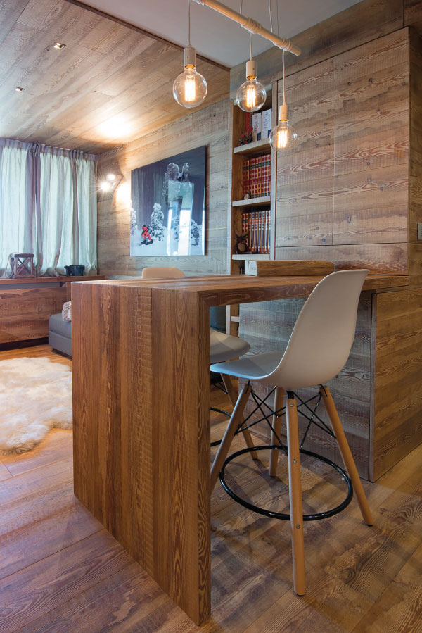 In questo mini appartamento di soli ventotto mq, ogni cosa trova il suo posto in una minima superficie. La cucina ben attrezzata e su misura, in larice termo-trattato e spazzolato, non si distacca dal resto della boiserie che riveste le pareti perimetrali unitamente alla pietra a vista. Un ampio bancone da lavoro e da pranzo separa la cucina dalla zona giorno dove troviamo un divano letto ed un funzionale camino a bioetanolo. La boiserie dell’ingresso nasconde vani utili per riporre suppellettili ed accessori. Come il resto, anche il piccolo bagno è stato curato con una precisione sartoriale: dispone infatti di ampia doccia con rivestimento in pietra e cascata per cervicale che non ha nulla da invidiare a servizi con metrature più generose.